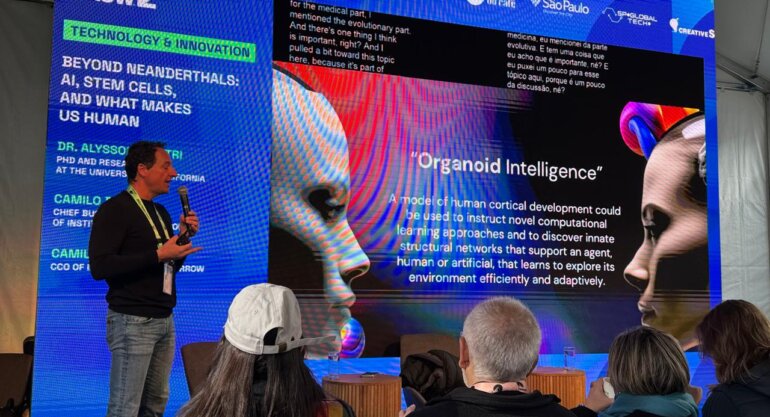 Ele falou sobre organoides cerebrais, pequenas estruturas cultivadas em laboratório a partir de células-tronco humanas que reproduzem características do cérebro. Esses modelos estão ajudando cientistas a estudar doenças neurológicas complexas como autismo, epilepsia e Alzheimer de forma muito mais precisa. Mas o ponto mais provocador da palestra foi outro. Esses organoides podem se tornar uma nova forma de computação.